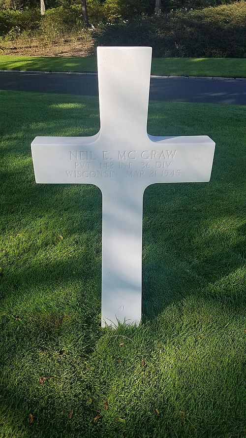 Pvt Neil E. McGraw is remembered at the Oxford Village Cemetery, Wisconsin.Source of information: Peter Schouteten, www.abmc.gov, www.wwiimemorial.com, www.archives.gov, https://texasmilitaryforcesmuseum.org/, www.ancestry.com - Headstone and Interment Record / Dobson Family Tree / 1940 Census, www.findagrave.com – Michael V Drachman / Janet Marie