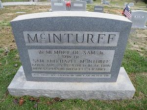 Pvt Samuel McInturff Jr. is remembered at the Liberty Baptist Church Cemetery in Maryville, Blout County, Tennessee.Source of information: Peter Schouteten, www.abmc.gov, www.wwiimemorial.com, www.ancestry.com - Headstone and Interment Record / U.S. WWII Draft Cards Young Men / 1930 Census, www.findagrave.com – David McInturff, www.super6th.org