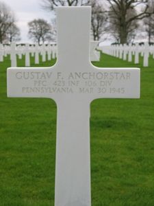Source of information: Peter Schouteten, Kurt Anchorstar (nephew), www.wwiimemorial.com, www.archives.gov, www.schuylkillhavenhistory.com, Book: Given Up For Dead: American GIs in the Nazi Concentration Camp at Berga by Flint Whitlock, www.ancestry.com - Headstone and Interment Record / 1940 Census / Veteran Compensation application File