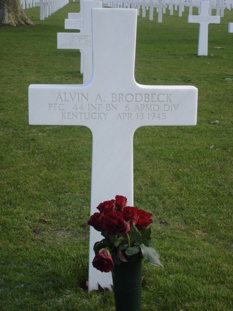 Instead of drawing army maps in New Jersey, he now underwent his baptism of fire as an armored infantryman in Nancy, Northern France, where Al Brodbeck was added to the 44th Battalion of the 6th Armored Division. His new unit then advanced through Germany and arrived in Groitzsch, in April 1945, where he was shot dead by an SS unit on Friday the 13th after volunteering for a night action.