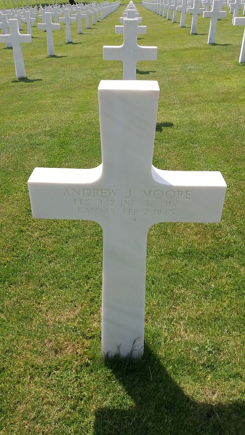 Pfc Andrew J. Moore enlisted at Fort Sill, Oklahoma on 26 May 1944.Source of information: Peter Schouteten, www.abmc.gov, www.wwiimemorial.com, www.archives.gov, https://texasmilitaryforcesmuseum.org/, www.ancestry.com - Headstone and Interment Record / Myers Tree / WWII Draft Cards Young Men, www.findagrave.com – Eric Ackerman