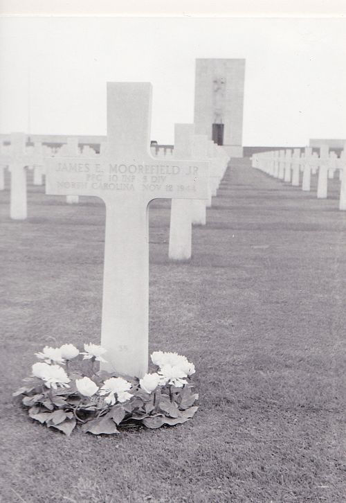 Pfc. James E. Moorefield enlisted at Ft. Bragg, North Carolina, on 20 January 1942.He worked in a furniture factory before he enlisted.
