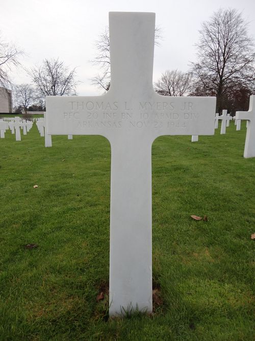 Pfc Thomas L. Myers Jr. attended high school for four years before he volunteered for the Army of the United States at Jefferson Barracks, Missouri on 25 April 1942.He was killed by a gunshot in his chest.
