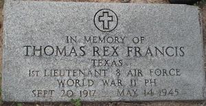 Thomas Francis attended A&M College of Texas (now Texas A&M University) as a member of the class of 1940, majoring in Agricultural Engineering. He graduated from Cadet School at Brooks Field in September 1942 and was commissioned as a Second Lieutenant.While the formation was under enemy aircraft attack, this B-17 pulled out of the formation to the left and was seen circling under control with fires under inboard sections and both wings.