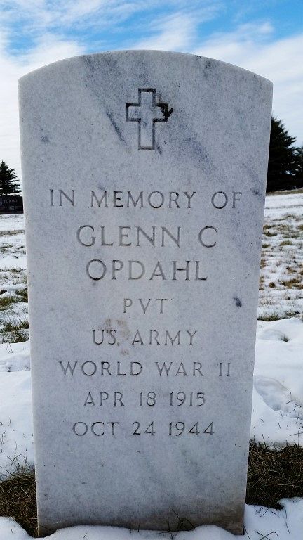 Pvt Glenn C. Opdahl was working at Pullman's Shipyards building rescue boats and working on barges before he enlisted on 1 April 1944.He is remembered at the Bethlehem Cemetery in Barnes County, North Dakota.