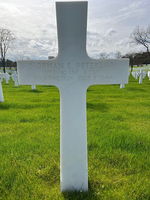 Pvt. Norman E. Peterson worked in a company building transport equipment befoe he enlisted in Seattle, Washington on 9 December 1943.He was first buried at the Temporary American Military Cemetery of Limey, France.