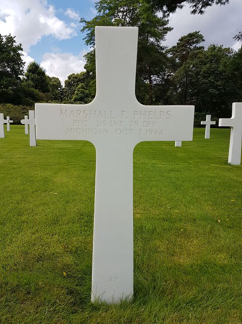 Pfc Marshall F. Phelps attended college for one year and was employed at the New York Central Railroad before he enlisted at Fort Custer, Michigan on 31 March 1942.He was first buried at the Temporary American Military Cemetery in Andilly, France.