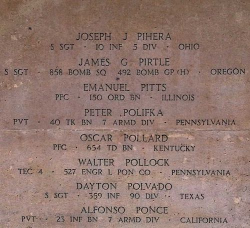 Polvado’s name is recorded on the Walls of the Missing at Lorraine American Cemetery. A rosette is placed next to his name to indicate he has been accounted for.