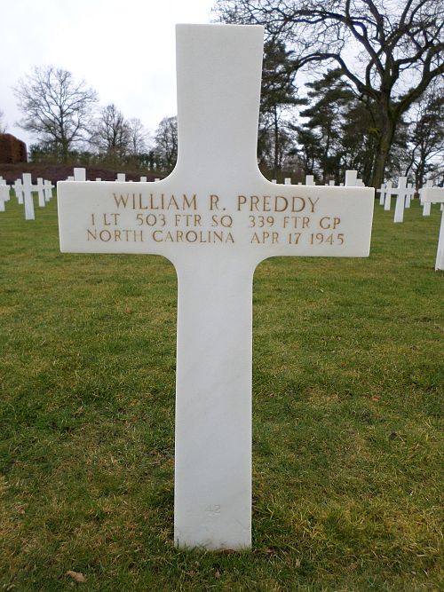 1st Lt William R. Preddy was first buried at a local cemetery but was later buried alongside his brother, Maj George E. Preddy, a P-51 pilot with the 328th Fighter Squadron, 352nd Fighter Group.