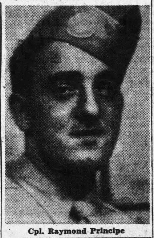 T/5 Raymond E. Principe was a plumber prentice, employed by William Yanny when he enlisted on 30 June 1942.He was killed by artillery shell fragments in the thorax.