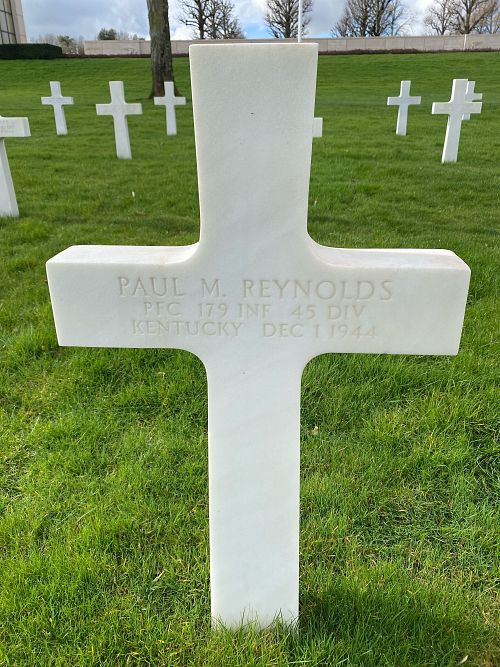 Pfc Paul M. Reynolds was first buried at the Temporary American Military Cemetery in Hochfelden, France.Source of information: Peter Schouteten, www.abmc.gov, www.wwiimemorial.com, www.ancestry.com - Headstone and Interment Record / 1940 Census / Kentucky Birth Index, http://www.45thdivision.org