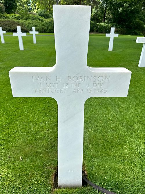 T/Sgt Ivan H. Robinson worked on a farm before he enlisted in Louisville, Kentucky on 5 January 1944.He had been to the machine gun section command post observing the location and emplacement of the guns. At 9 a.m., he left to check on the mortars. As he was moving between the two sections, he was hit and killed instantly by a burst of machine gun fire.