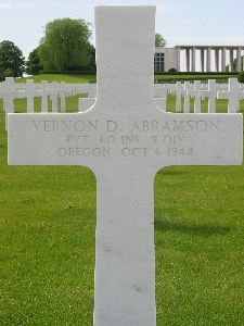 Pvt Vernon D. Abramson enlisted in San Fransisco, California on 31 July 1943.Source of information: Peter Schouteten, WWIIMemorial.com, Archives.gov - WWII Enlistment Record, www.ancestry.com - U.S., Headstone and Interment Records for U.S. Military Cemeteries on Foreign Soil / U.S., WWII Jewish Servicemen Cards, WWII Draft Cards, 1930 US Census