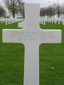 Cpl Louis H. Brodman enlisted at Fort Hayes, Columbus, Ohio on 4 February 1942.He trained at Camp Polk, Louisiana and landed in England June 5, 1944. On August 10 he arrived in France and took part in the spearhead attack across France with Patton´s Third Army. Six weeks later he joined Hodge´s First Army in Holland which was set back at St. Nith, Belgium, during the German offensive in December. During 11 months overseas as a tank gunner he saw action in the Battles of Verdun, Antwerp, the loss of St. Nith, its recapture. At the time of his death he was at the Ruhr Pocket where over 300,000 Germans were trapped. His last letter dated April 1.