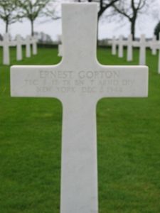 T/4 Ernest Gorton enlisted 13 March 1942 at Camp Upton in Yaphank, New York. He was sent overseas in April 1944.He was wounded at Metz on 20 April 1944, for which he was awarded the Purple Heart a first time and was discharged from the General Hospital in France on 27 October 1944.