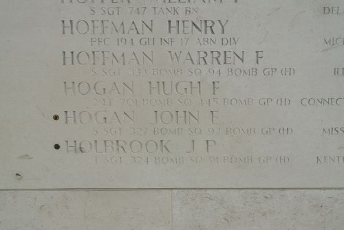 John E. Hogan graduated from West Plains High School in 1942 where he won the title of Best Citizen. He attended the University of Missouri for one semester before he enlisted on 17 April 1944. He was overseas for only three months.The airplane feathered one engine and left the formation about halfway between the target and Frankfurt, shortly after the formation was attacked by fighters. The pilot looked for a suitable place for an emergency landing, but the aircraft lost altitude very rapidly, hit a chimney on a house, and crashed at 1245 hrs at the railway line on point 184,8. Only one crewmember had time to jump before the crash.