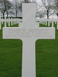 Pvt Ralph W. Ashworth worked on a farm before he enlisted at Fort Bragg, North Carolina on 26 June 1944.He died of a severe fracture wound of the head.