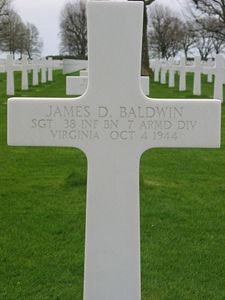 Sgt Baldwin was initially buried in an isolated grave with a crude cross with two identification tags attached. This grave was in a field on the Overloonse Weg and the Hattertweg in Vierlingsbeek. From the appearance and crude fashion of the grave, it was thought it was erected by civilians. It was discovered by members of Company A of the 1257th Engineer Combat Battalion on 22 March 1945.
