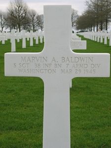 S/Sgt Marvin A. Baldwin enlisted in Spokane, Washington on 12 February 1943.He was initially buried at the Temporary American Military Cemetery in Ittenbach, Germany on 31 March 1945. On 23 August 1945, he was reburied at Margraten in a temporary grave. He was disinterred on 15 September 1948 and his remains were prepared and placed in a casket on 16 September 1948. He was given his final resting place on 21 December 1948.