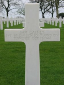 In September 1945, the remains of Pvt Sam Cathey were discovered in an isolated grave in a field near the farm "De Witte Hoeve", marked with a wooden cross. It is believed he was killed in that area, together with another member of his unit, who was also buried at the same spot. At the moment of the discovery, Pvt Cathey couldn't be identified and his remains were marked as Unknown T-2319 and evacuated to Margraten.On the basis of a tooth chart a positive identification could be made in May 1947.