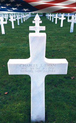 Pfc Charles J. Swan graduated from Roosevelt High School in Chicago and was employed by the Drake Bowling area when he enlisted on 12 March 1943.In May 1944 he was hospitalized because of chickenpox.