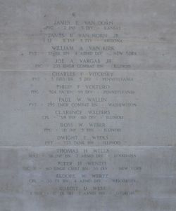 1st Lt James B. Van Horn graduated from the University of Arizona in 1937. He was a teacher at Mansfield Junior High School.Lt Van Horn together with a B Company rifleman rushed to the entrance of the main fort, but both were killed immediately by machinegun fire. due to the tactical situation at the time this incident occured, the fact that the enemy regained and occupied the fort for a period of three months, no attempt could be made to evacuate the remains and no subsequent search of the area could be made by the unit concerned. A field investigation was conducted in the area in november 1946 with negative results.