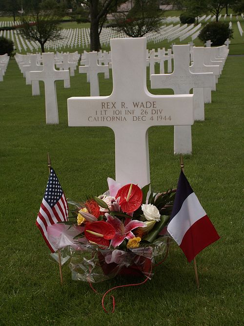 1st Lt Rex R. Wade attended college for two years and was an attendant at a filling station and parking lot before he joined the National Guard in Ontario AAF, California on 3 March 1941.He died on 4 December 1944 as a result of wounds received in action on 1 December 1944.