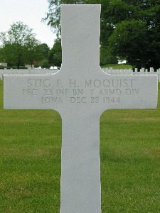 Pfc Moquist was initially buried at the Temporary American Military Cemetery of Foy, Belgium.At the time of his death, his father was living in Orebro, Sweden.