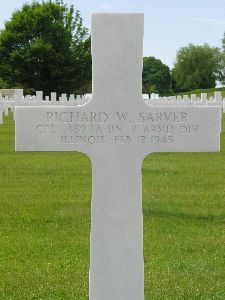 Cpl Richard W. Sarver enlisted in the US Army at Chicago, Illinois on 25 September 1942.Source of information: Peter Schouteten, Carla Mans, Sheree Dowdle, www.wwiimeorial.com, www.archives.gov, 7tharmddiv.org, www.ancestry.com - Headstone and Interment Record / U.S. WWII Draft Cards Young Men / Family Trees