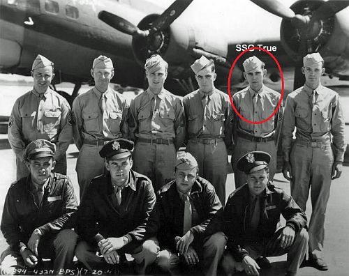 After graduating at Spencerport High School, Robert True was employed by the International Business Machines Corporation as a payroll clerk and timekeeper. He enlisted in Rochester on 14 September 1942.The airplane was hit by flak over the target, knocking out #2 engine. Oil vapor came out the #2 nacelle and the propeller was windmilling. also #1 engine was hit and was feathered. It kept up with the formation for about ten minutes and then dropped out and was observed to be losing altitude. Later the plane was attacked by German fighters, hitting it near the cockpit.