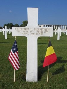 Pfc Merrithew's family emigrated to Maine in 1922. He completed one year at Maine Central Institute. According to stories his sister Mildred shared, Bill was a kind and sweet brother, who would walk her to and from school when she started first grade. Bill enjoyed working with wood and making furniture. He also helped his father on the farm: haying and tending to various gardens.He worked at the Pioneer Mill and enlisted in Bangor, Maine on 22 May 1942. He was sent overseas in May 1944 and entered France shortly after D-Day.