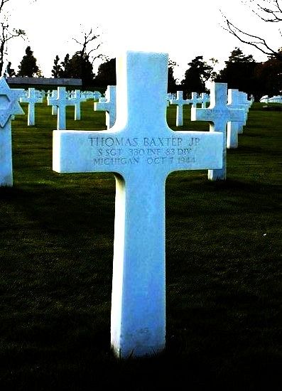 Thomas Baxter Jr. was a stock clerk with the Cadillac Company before he enlisted at Fort Custer, Michigan on 4 March 1942. He was sent overseas in April 1944.He was awarded the Bronze Star Medal for heroic achievement from 6 to 9 August 1944 in the vicinity of St. Joseph and St. Malo, France where he made several trips to the front for his wounded battalion commander to gain vital information.