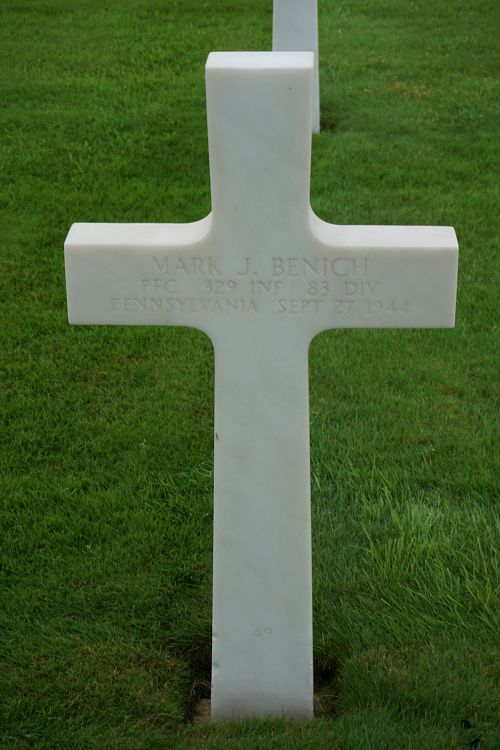 Pfc Mark J. Benich attended high school for 1 year before he enlisted in Pittsburgh, Pennsylvania on 13 May 1941.He was first buried at Temporary American Military Cemetery Andilly, France.