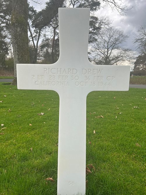 "On 18 October 1944 I was leading a flight of four P47 type airplanes on a Weather Reconnaissance mission to the area of Marburg, Germany. At approximately 1100 hours we were at an altitude of 2,000 feet starting up through the overcast. At about 4,000 feet Lt. Richard Drew, who was flying my wing, began to get shaky and his airplane jumped around in formation. A few seconds later he barely missed running into my airplane and as I last saw him he swung wide to the left and it looked as though he was straightening out but he disappeared in the overcast. I immediately called him on the radio giving the course but there was no acknowledgement from him. The leader of the second element of the formation, Lt. James C. Coe, and I broke out of the overcast at 6,000 feet and made a circle to try to pick him up and we didn’t see him from the overcast. Flak became quite accurate and we left the area."