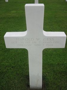 Sgt Harold W. Gess enlisted in Portland, Oregon on 20 May 1942.His twin brother, Gerald, was stationed at Camp Roberts and his brother, Orville served in the Pacific when he was killed.