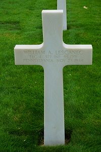 T/4 William A. Lescanec was a graduate of Steelton High School and associated with his father in the meat and grocery business before he enlisted in New Cumberland, Pennsylvania on 20 March 1942. He trained at Camp Lee, Va.; Camp Pickett, Va.; Ft. McClellan, Ala.; Camp Hood, Tex., and Camp Blanding Fla. He was reported killed Thanksgiving Day.He was first buried at Temporary American Military Cemetery Limey, France.