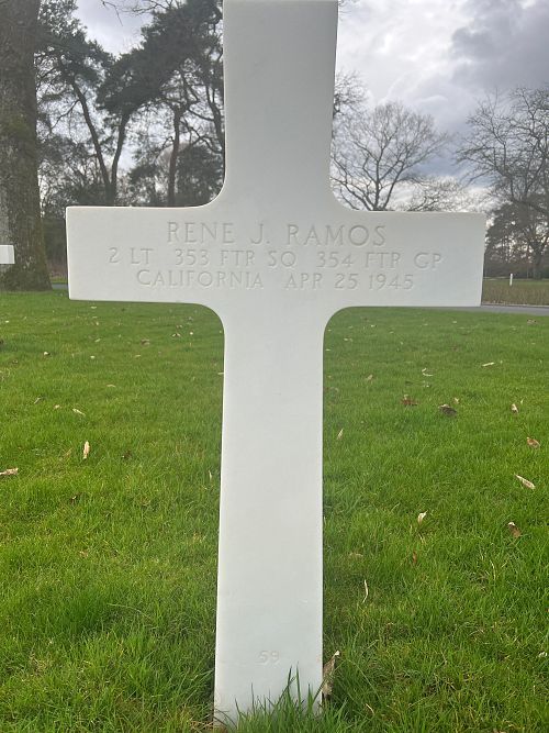 Statement from Capt Bruce W. Carr:"2nd Lt Rene J. Ramos, flying White 4, strafed to the left side of the airdrome. I didn’t see Lt Ramos’s ship until I pulled up from the strafing pass, about 5 minutes after we left the airdrome flying an easterly course. Lt Ramos still flying formation, called and informed me his engine had quit. I instructed Lt Ramos to change gas tanks and inquired as to his oil pressure. Lt Ramos informed me he had no oil pressure. I then told him to set a course of 270 degrees and keep going – I could see Lt Ramos all this time because he was on my wing. Lt Ramos could not get his engine started and kept losing altitude. He asked me what to do, and I told him to bail out. At this time, we were at 6,000 ft. and I had moved back and was flying Lt Ramos’s wing. Lt Ramos kept going down, and at 2,000 ft., he told me he was going to crash-land his ship. At 1,000 ft. Lt Ramos jettisoned his canopy, and at 800 ft., he jumped. His chute opened about the same time he hit the ground. I buzzed the spot where Lt Ramos hit the ground and from about 10 ft. saw him lying on the ground pretty badly smashed up."
