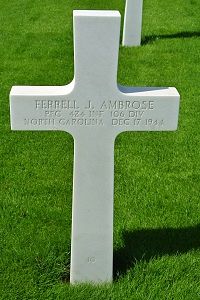 Pfc Ferrell J. Ambrose joined the Regular Army on 26 September 1939.Source of information: Leo Minne, www.abmc.gov, www.wwiimemorial.com, www.ancestry.com - Headstone and Interment Record / 1930/1940 Census / North Carolina Birth Index, www.indianamilitary.org/106ID
