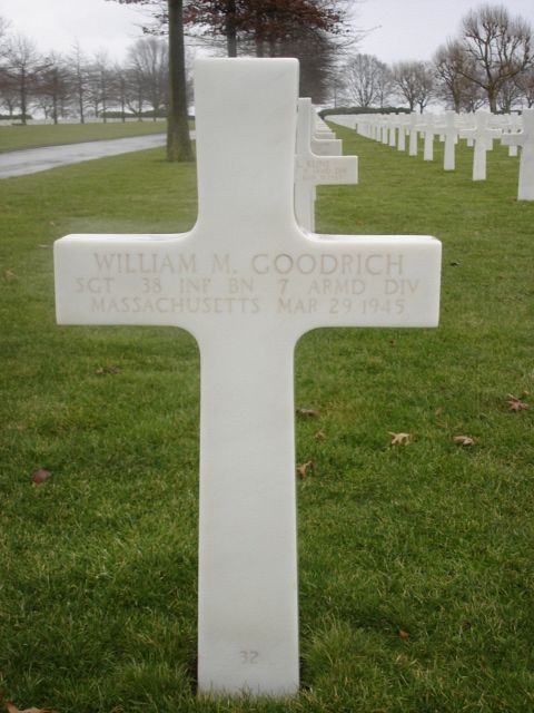 Sgt William M. Goodrich graduated from Jamaica Plain High School in Boston in 1941 and worked in the manufacturing industry of professional and scientific apparatus.He enlisted in Boston, Massachusetts on 14 April 1943.