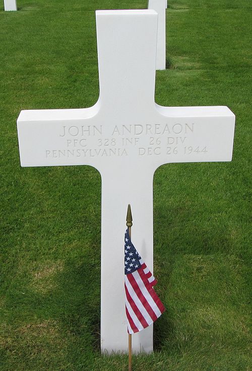 Pfc John Andreaon attended high school for four years and was a painter before he enlisted at Fort G. Meade, Maryland on 10 March 1942.He was first buried at the Temporary American Military Cemetery in Grand-Failly, France.