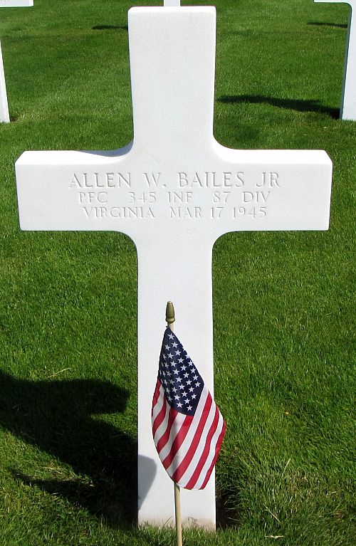 Pfc Allen W. Bailes Jr. was a painter in construction and maintenance before he enlisted in Huntington, West Virginia on 21 July 1944.Source of information: Peter Schouteten, Judy Bailes, www.abmc.gov, www.wwiimemorial.com – James Amor, www.archives.gov – WWII Enlistment Record, www.ancestry.com - Headstone and Interment Record / U.S. WWII Draft Cards Young Men / 1930/1940 Census / Long Family Tree, 87thinfantrydivision.com, www.findagrave.com