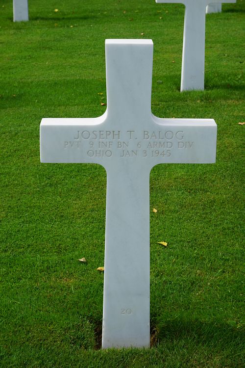 Pvt Joseph T. Balog attended high school for two years and was a driver before he volunteered for the Army of the United States at Fort Hayes, Ohio on 19 December 1941.He was first buried at the Temporary American Military Cemetery in Grand Failly, France.