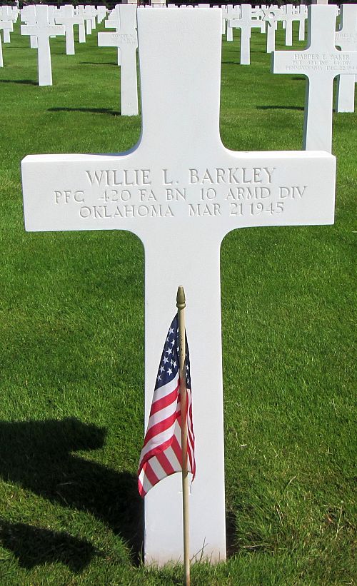 Pfc Willie L. Barkley worked on a farm before he enlisted in Tulsa, Oklahoma on 25 November 1942.He was killed by artillery shell fragments in his chest.