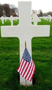 Pvt William J. Bennett was first buried at the Temporary American Military Cemetery in Grand Failly, France.Source of information: Peter Schouteten, www.abmc.gov, www.wwiimemorial.com, www.ancestry.com - Headstone and Interment Record, www.findagrave.com, www.super6th.org