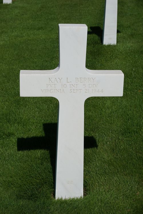 Pvt. Kay L. Berry enlisted in Abington, Virginia on 2 June 1943.Source of information: Leo Minne, www.abmc.gov, www.wwiimemorial.com, www.archives.gov – WWII Enlistment Record, www.ancestry.com – 1930/1940 Census / Headstone and Interment Record 1942-1949 / Courtney Dennis Family Tree / U.S. WWII Draft Cards Young Men, A footsoldier for Patton / Michael C. Bilder James G. Bilder, The 5th Infantry division in the ETO