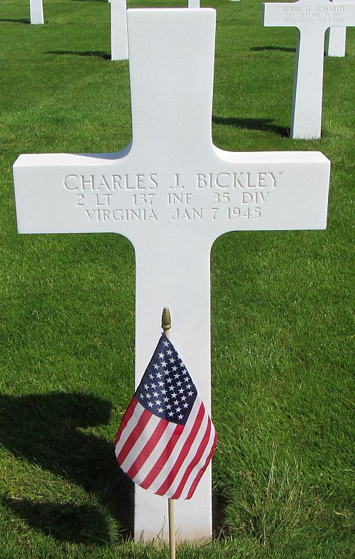 2nd Lt Charles J. Bickley graduated from Wise High School in 1931 and attended Emory and Henry College for two years. He held a position with the Holston Ordnance Works at Kingsport.He enlisted at Fort Oglethorpe, Georgia on 6 December 1942 and sent overseas on 13 July 1944.
