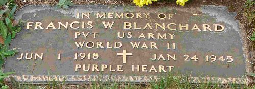 Pvt Francis W. Blanchard graduated from Swartz Creek High School and was a meat cutter in a grocerystore before he enlisted.Pvt Blanchard is remembered at Maple Forest Cemetery in Maple Forest Township, Crawford County, Michigan with a memorial marker.