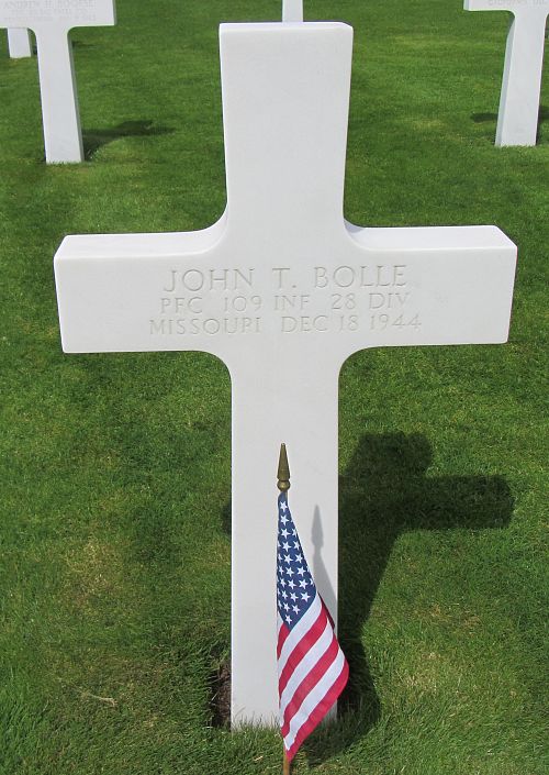 Pfc John T. Bolle Sr. attended college and was a draftsman before he enlisted at Jefferson Barracks, Missouri on 21 September 1943.Source of information: Ralph Peeters, Peter Schouteten, www.abmc.gov, www.wwiimemorial.com, www.archives.gov – WWII Enlistment Record, www.ancestry.com - Headstone and Interment Record / White Harms Family Tree / Presbyterian Church Records, www.findagrave.com