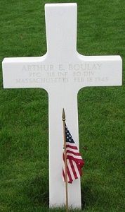 Pfc Arthur E. Boulay was a road worker employed by the Tredennick Billings Co. before he enlisted at Fort Devens, Massachusetts on 15 March 1944.He trained at Camp Croft, South Carolina. He was stationed in Washington when he received his overseas orders in September 1944. Prior to his induction he was employed at the Pepperell Manufacturing Company. Pfc Boulay was wounded in action in France on 8 November 1944 and forwarded his Purple Heart Medal to his parents. After recovering in a hospital in England from shrapnel wounds of both arms, legs and neck, he returned to his unit. He was last heard from in a letter dated 24 November 1944, the date he returned to his outfit, his parents believed.