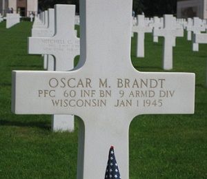 Pfc Oscar M. Brandt enlisted in Milwaukee, Wisconsin on 8 October 1942.Source of information: André Koch, www.abmc.gov, www.wwiimemorial.com, www.archives.gov - WWII Enlistment Record, www.ancestry.com - Headstone and Interment Record / 1920/1930/1940 Census / U.S. WWII Draft Cards Young Men 1940-1947, www.newspapers.com - Wisconsin State Journal - 5 January 1979, After Action Report 60th Armored Infantry Battalion